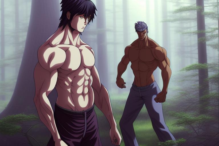Anime style painting of Two figures standing in a dense, misty forest with tall trees. The foreground shows a muscular …