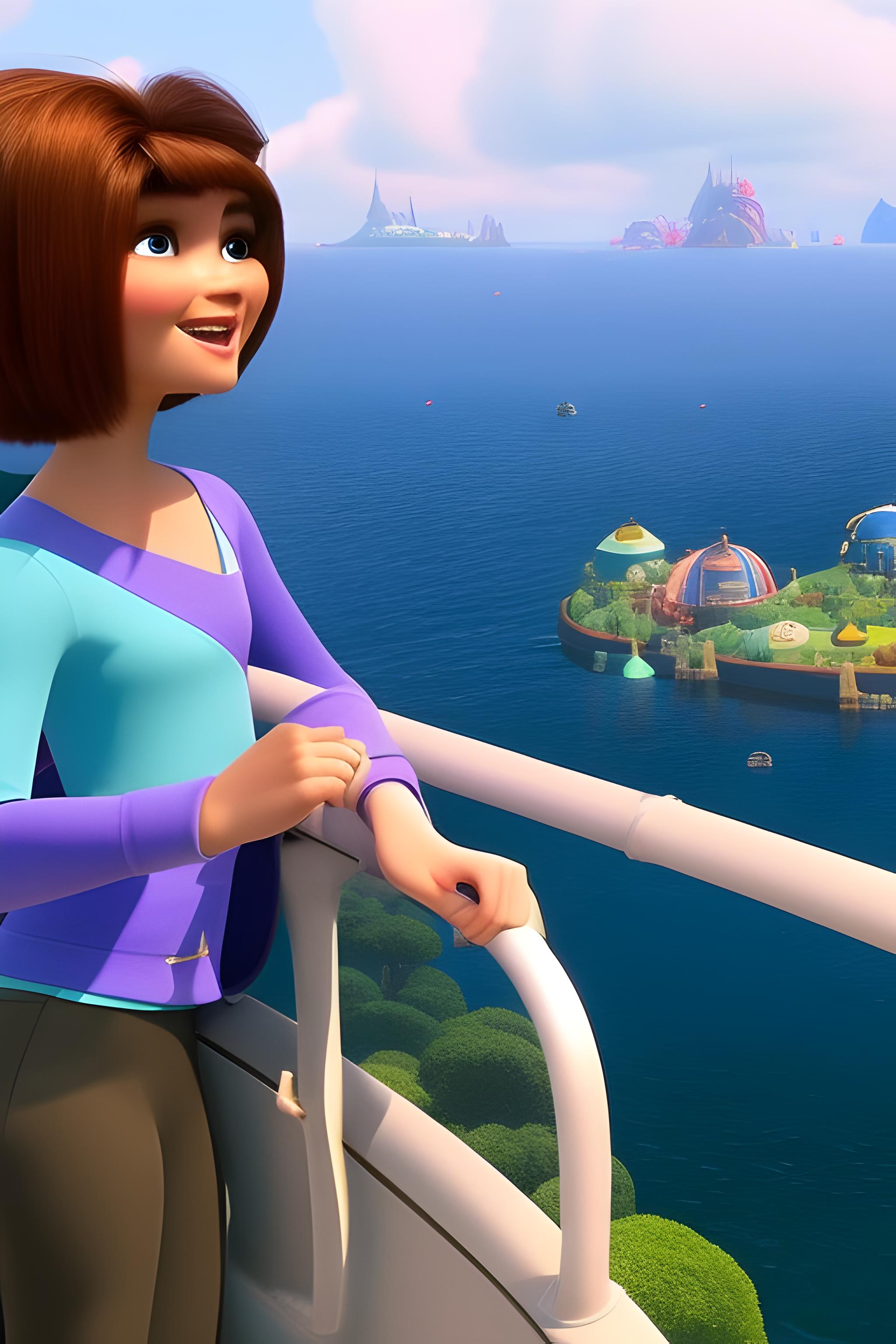 Объедени эти два изображения в стиле Disney Pixar, где мужчина смотрит с неба на девушку