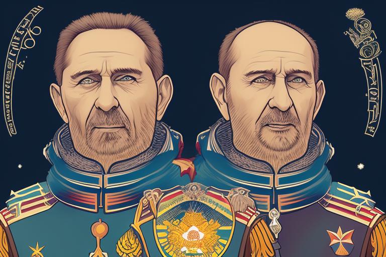 Весит портрет с моим лицом и мужчина в военной форме стоит смотрит на портрет