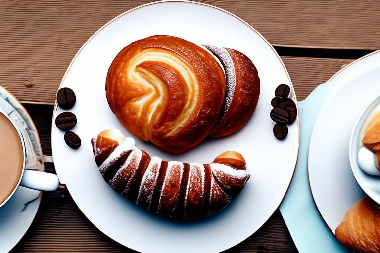 Lav et reklamebillede med nedenstående tilbud på morgenmad på tysk ☕ Kaffee & Croissant – 5 € 🍰 Kaffee & Kuchen – 5 € 🥐…
