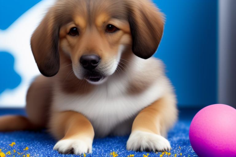 Lief blauw geel hondje speelt met peuter en ballen