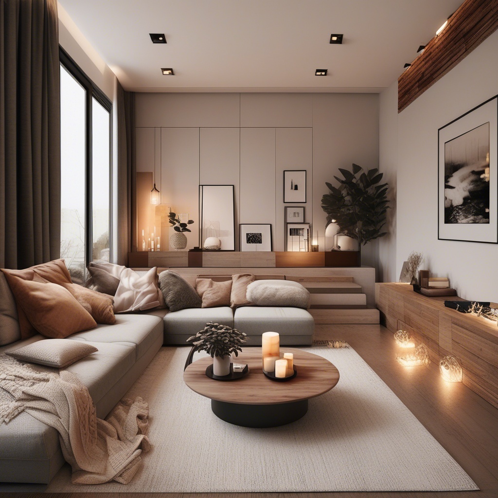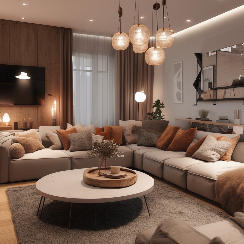 A modern living room, warm lighting, cozy textures
