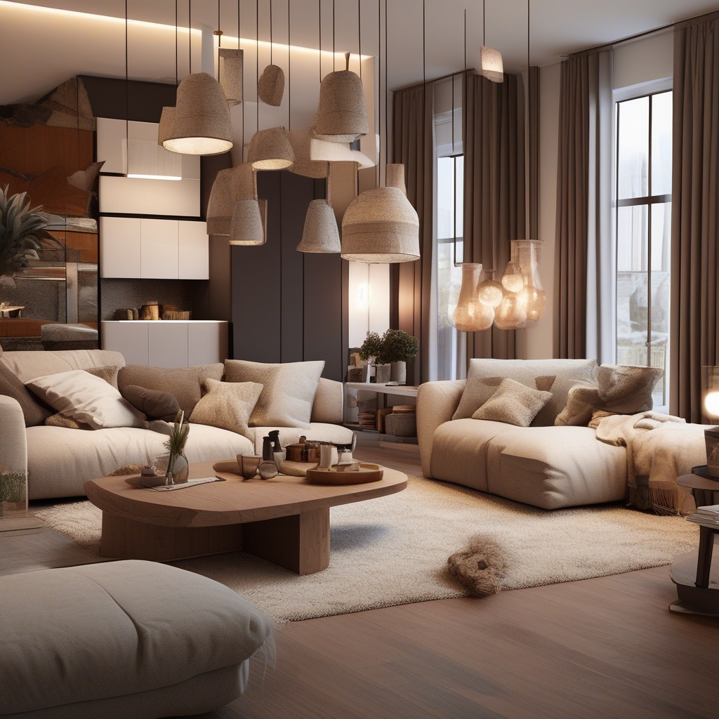 A modern living room, warm lighting, cozy textures