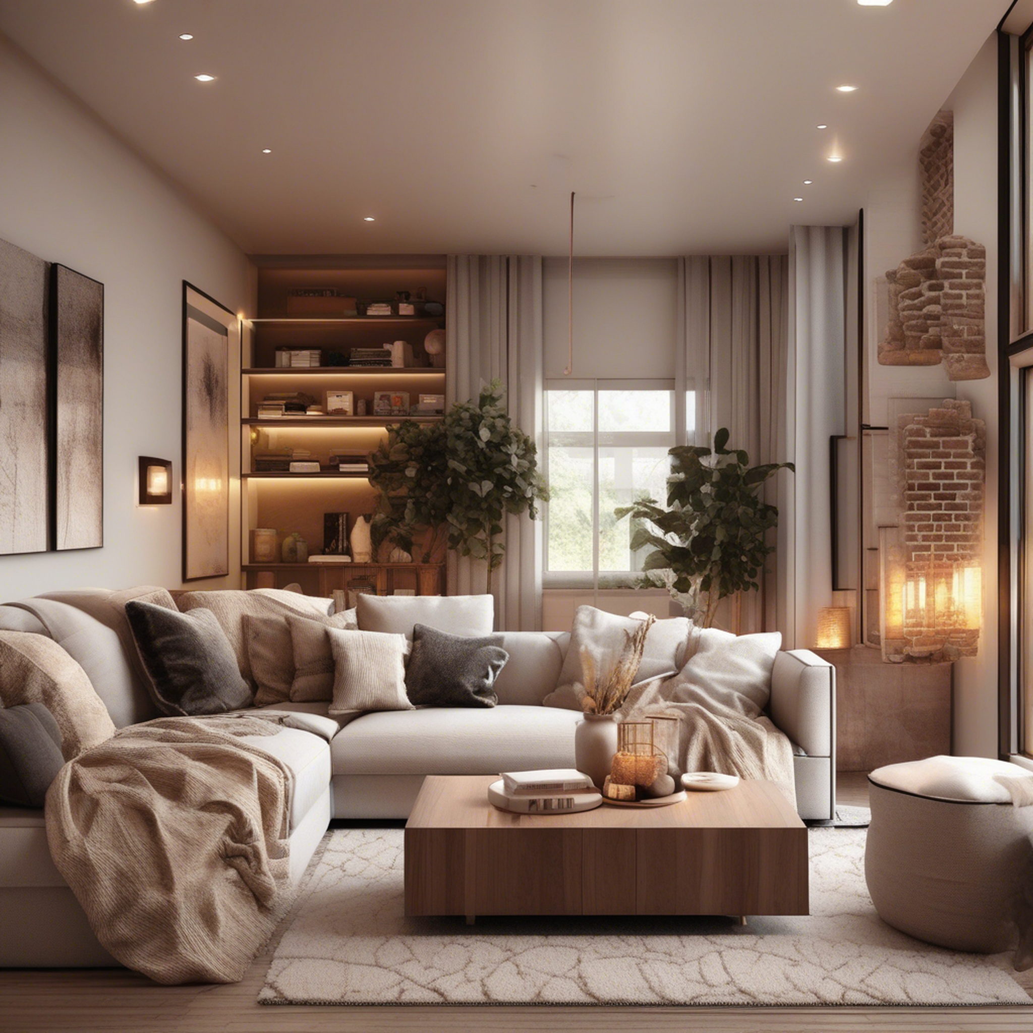 A modern living room, warm lighting, cozy textures