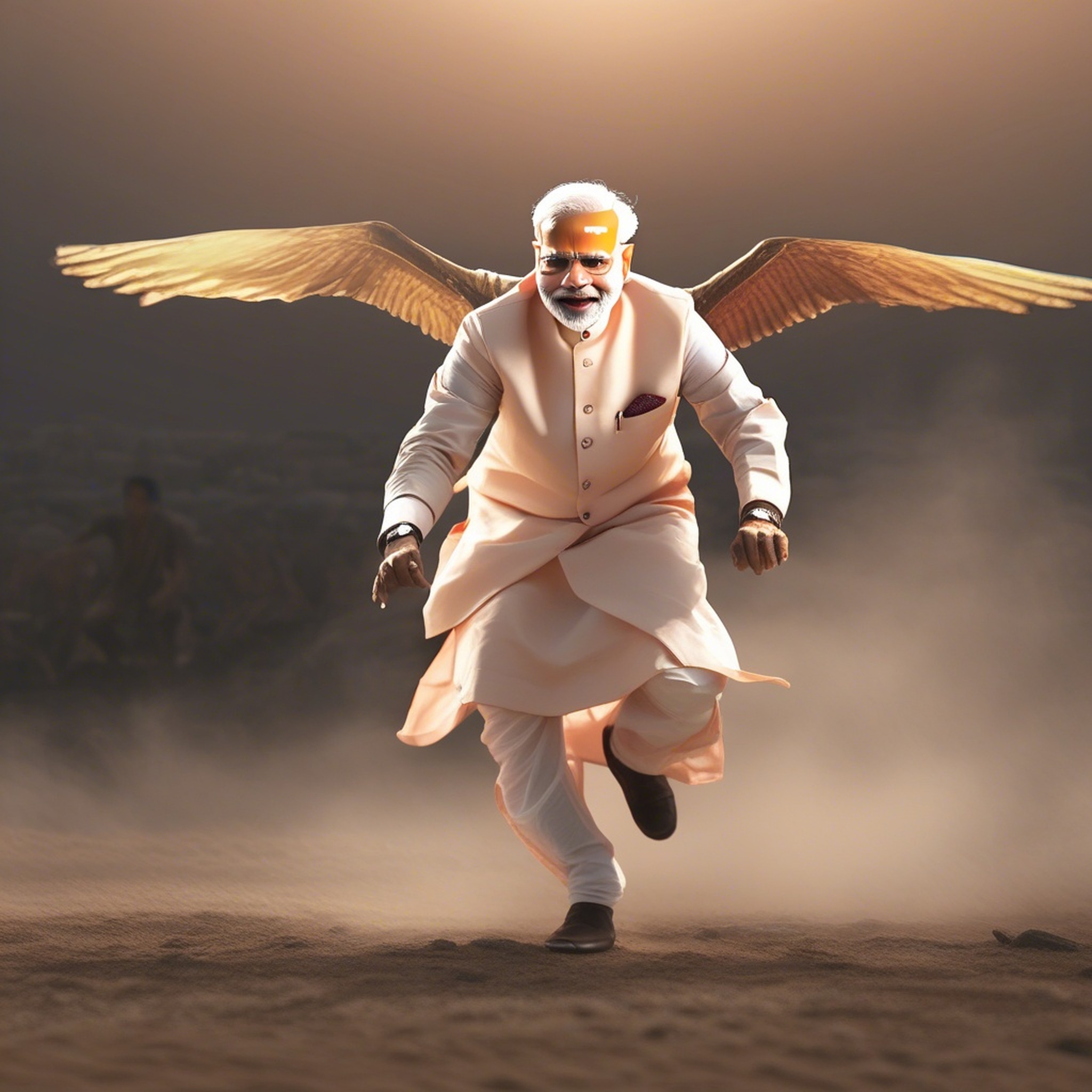 Modi flying , cinematic lighting, dramatic composition